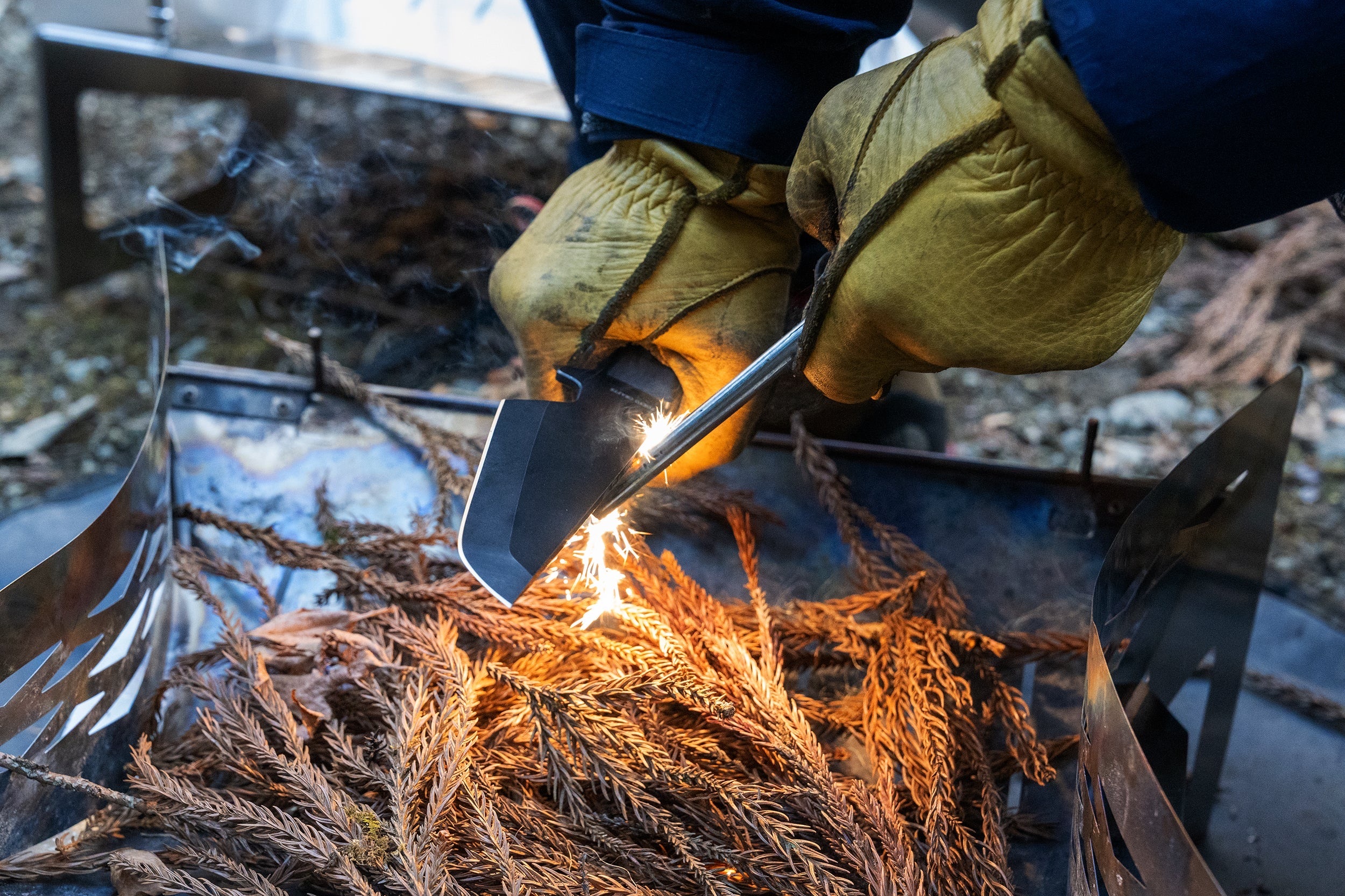可使用刀背刮打火石來輕鬆起火。